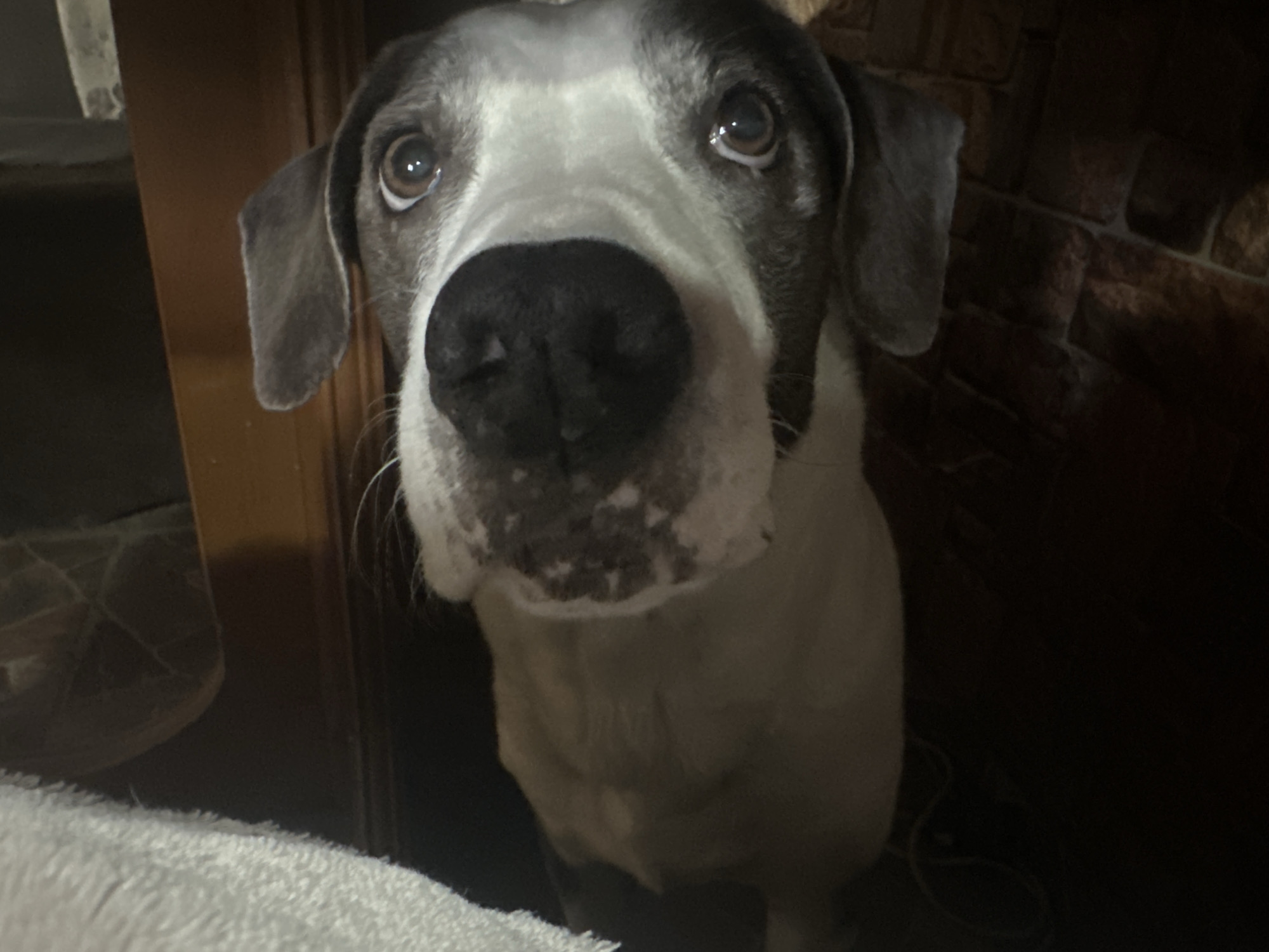 The scene is set indoors in Aldomirovtsi, Bulgaria. The primary subject is a dog, positioned centrally and facing directly towards the viewer. The dog has short fur, predominantly white on its muzzle and forehead, with dark grey-black patches on the top of its head, around its eyes, and on its dropped ears. Its eyes are dark brown, and its nose is black. The dog appears to be looking upwards and slightly to the right of the frame, with an attentive expression. In the foreground, at the bottom left, a white, textured fabric, possibly a blanket or towel, is visible. The background on the left is dark and indistinct, showing a brown vertical surface. The background on the right features a dark brick wall texture. The overall lighting is dim, casting the background into shadows. No human subjects are visible.