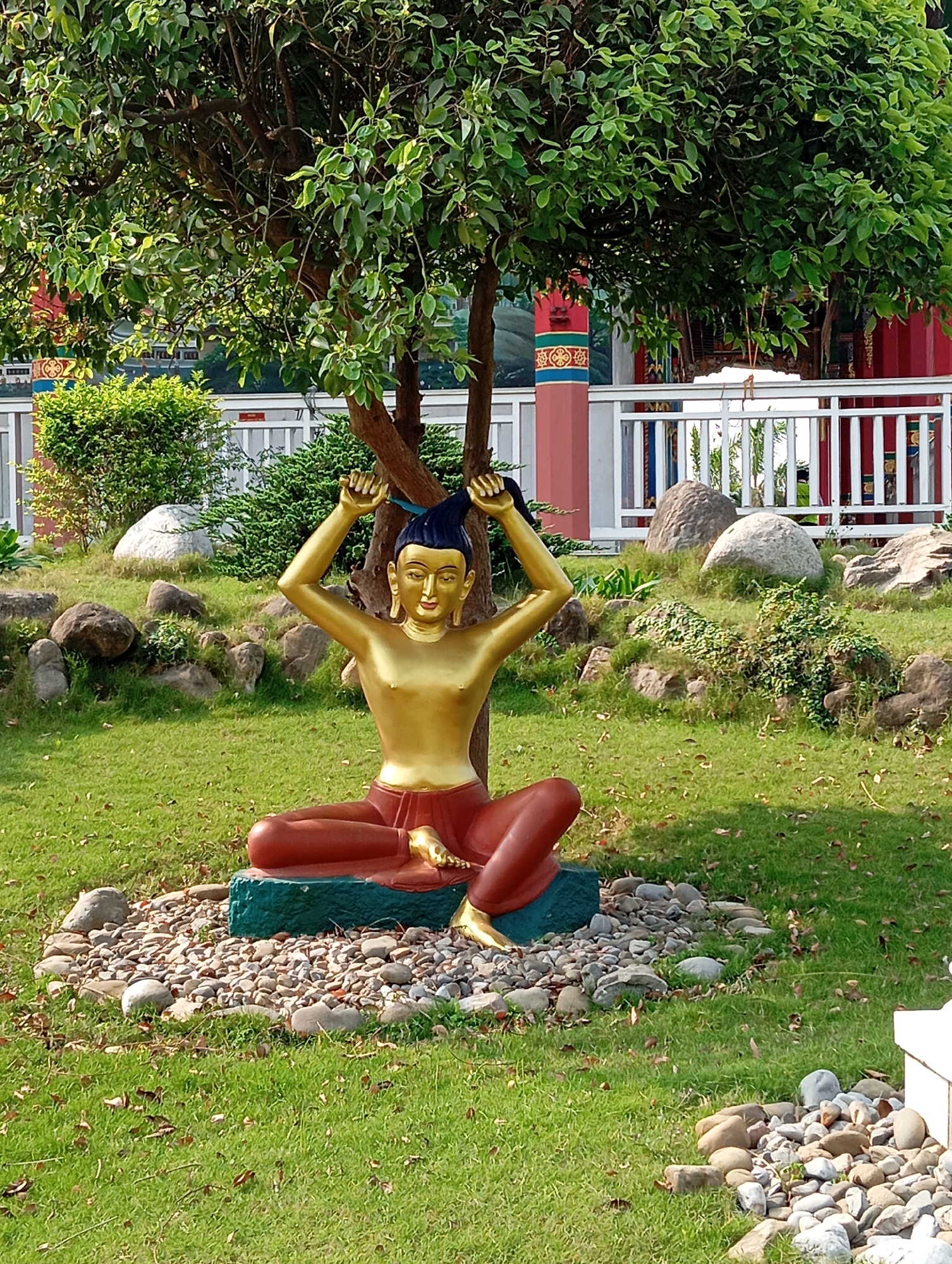 The image captures a golden statue of a figure in a seated position with arms raised, as if tying hair. The statue is located in Lumbini Sanskritik, Nepal, in a garden-like setting with a lush green lawn, scattered rocks, small shrubs, and a tree under which the statue sits. The statue rests on a dark green base, surrounded by small stones. A white fence with red and ornate pillars is visible in the background, along with greenery and what appears to be a building or structure. The lighting suggests it is daytime.