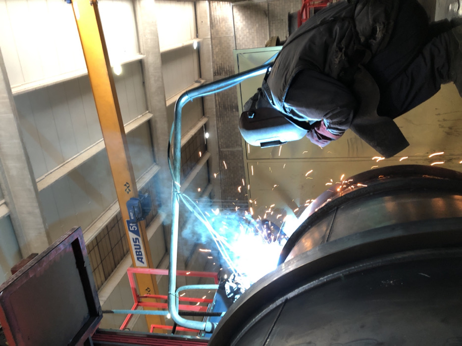 The image displays an active welding operation taking place inside an industrial facility in Čeluga, Montenegro