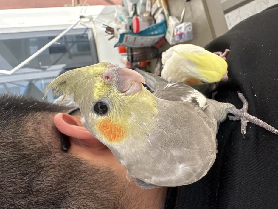 - "The image displays two cockatiels perched on the right shoulder of an individual, viewed from behind, in what appears to be an outdoor or semi-outdoor setting in Longhua District, China" by FM-Ribsj1, licensed under CC BY 4.0