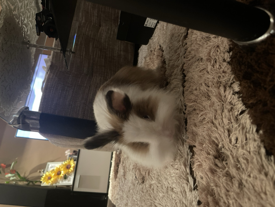 - "Inside a residence in Novi Iskar, Bulgaria, a small domestic rabbit, predominantly white with brown and tan markings on its face, ears, and back, is positioned centrally on a shaggy, light beige area rug" by FM-ScxXs2, licensed under CC BY 4.0