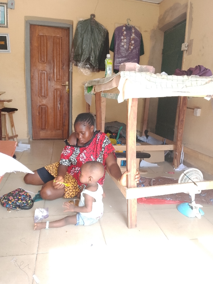 The image captures an indoor scene in Lokoja, Nigeria, featuring an adult female and a young child