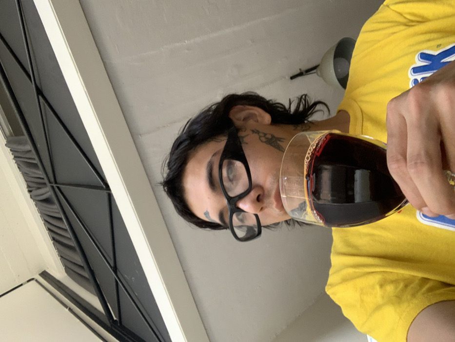 A single male individual is depicted indoors, holding a wine glass containing dark red liquid. The subject has dark, shoulder-length hair, wears black, thick-rimmed rectangular glasses, and sports multiple tattoos, including a small mark above the right eyebrow and an intricate design on the right side of the face/temple. He is dressed in a yellow short-sleeved t-shirt with a partial blue and white logo visible on the lower right. The individual's right hand grips the stem and base of the wine glass, which is positioned near his mouth, suggesting an action of drinking or holding the beverage. His gaze is directed upwards and to the right of the frame. The background features a light grey wall, a white-framed window with a black geometric metal grille and dark grey curtains, and a partially visible grey industrial-style pendant lamp in the upper right. The scene is located in Vicente López, Argentina.