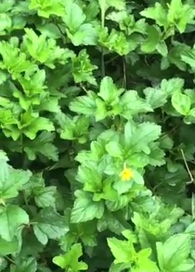 close-up of a bush with bright green leaves and small yellow flowers. The camera pans slightly across the bush. The lighting is soft, suggesting an overcast day. There are hints of taller grasses in the background.