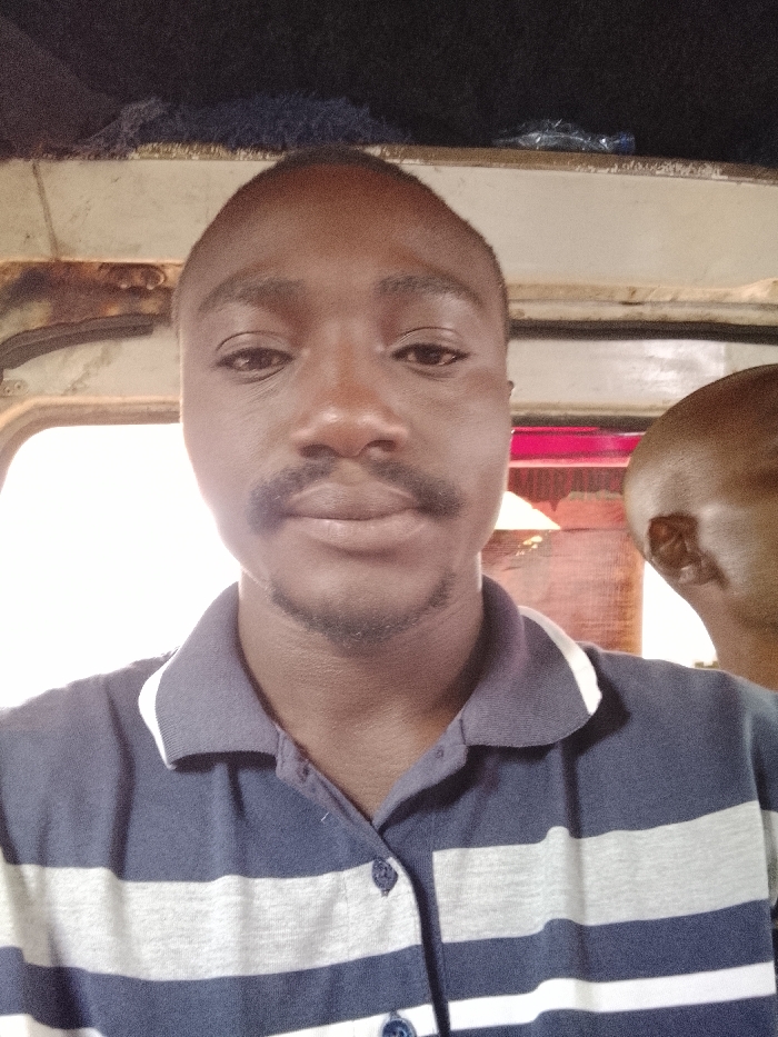 A medium shot captures a dark-skinned man with a mustache and a stubbled goatee. He is wearing a blue and white striped polo shirt. The setting appears to be inside a vehicle, indicated by the aged interior. Another person is partially visible on the right, out of focus. The lighting in the image is diffused.