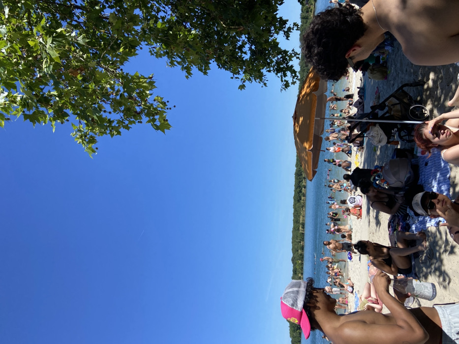 scene of people enjoying a sunny day at a lake in Tournefeuille, France. The coordinates provided, latitude 43.568 and longitude 1.344, correspond to a location near the Lac de la Ramée. The image shows numerous people on the sandy shore and in the water of the lake. There is a large, orange umbrella in the center of the image, providing shade for several people. The foreground shows a man with a pink baseball cap, facing the camera and holding a water bottle, interacting with another man wearing a white shirt. A woman in a bathing suit is sitting in front of him, while another woman is further back, to the right. To the right, a man with curly hair is standing with his back to the camera, looking to the right. The background shows a large group of people enjoying the lake, some wading in the water, some sitting on the shore, and others walking along the edge of the lake. The image captures a relaxed and enjoyable atmosphere at the lake. The sky is bright blue and clear, indicating a sunny day. The trees in the background and in the upper right corner of the image provide shade, creating a contrast between the bright sun and shaded areas. There is a dense growth of green vegetation at the edge of the lake, which further enhances the beauty of the scene. The image captures a typical summer day, with people enjoying the outdoors.
