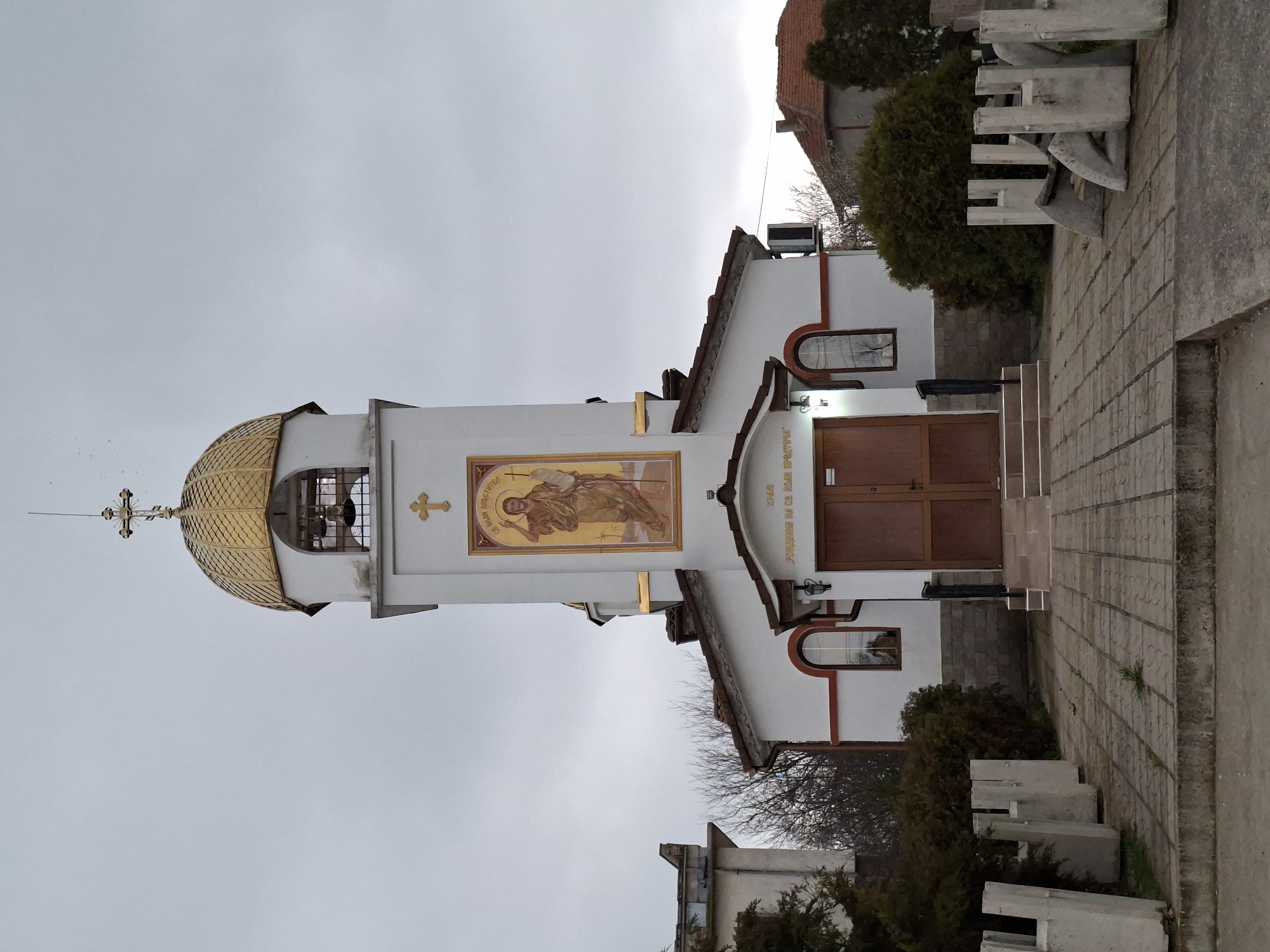 An exterior, eye-level, full-frontal photographic depiction of the Church of the Nativity of St. John the Baptist, located in Shumen, Bulgaria, under an overcast sky. The single-story church features white-painted walls with red trim and a brown tiled roof. A central bell tower rises above the main structure, topped with a golden-colored dome, a finial, and a cross. A bell is visible through an arched opening in the tower. Below the dome, on the tower's facade, is a golden-colored cross and a large mosaic depicting a standing male saint holding a staff with a cross, set against a gold background. Below this mosaic, directly above the main entrance, is an inscription in Cyrillic. The main entrance consists of double brown wooden doors, accessed via two steps. Two arched windows with brown frames are situated on the lower facade, one on each side of the entrance area. The foreground consists of a paved pathway made of square concrete tiles, leading towards the church steps. This path is bordered by a series of approximately knee-high, rectangular concrete bollard-like structures, some exhibiting signs of damage or decay. Dark green bushes flank the pathway on both sides. In the background, partially obscured by bare trees, are residential buildings with tiled roofs and a taller, lighter-colored multi-story building. No individuals are visible in the scene.