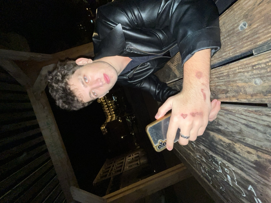 A young male, estimated to be in his twenties, with dark curly hair and light-colored eyes, is seated at a wooden picnic table at night in Marseille, France. He wears a black leather jacket over a dark shirt and looks directly at the camera with a neutral expression. His left hand holds a gold-cased smartphone. His right hand, resting on the tabletop and adorned with a silver ring on the ring finger, exhibits multiple red-brown marks consistent with healing abrasions or burns on the dorsal surface and forearm. The wooden table bears etched graffiti. Overhead, a wooden support structure is partially visible. In the background, the illuminated Palais du Pharo is prominently featured on the right, overlooking the city's Vieux-Port, with other city buildings and lights visible in the distance.