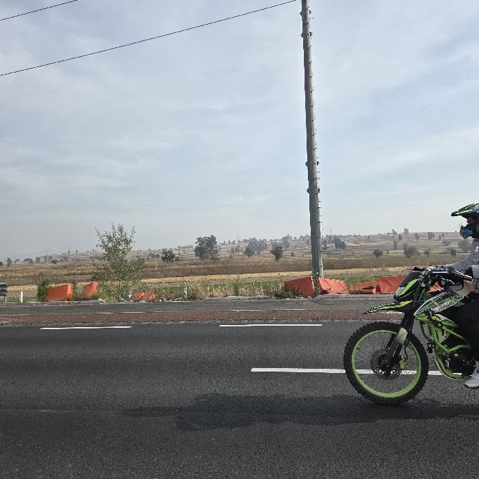 A motorcycle speeds along a black asphalt road, passing a utility pole. The rider, wearing a helmet, is partially visible. The motorcycle is green with lime green rims. The roadside is lined with orange barriers, beyond which is a field of brown and green vegetation. The sky is overcast, creating a hazy atmosphere. Distant trees dot the landscape.