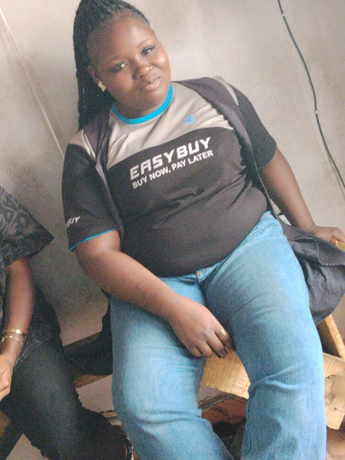 A medium shot captures one primary female subject seated indoors, with a portion of a second individual visible on the left. The primary subject is an adult female with dark skin and dark braided hair pulled back. She wears a two-tone t-shirt, light grey across the upper chest and black below, emblazoned with the white text "EASYBUY BUY NOW, PAY LATER." A dark-colored jacket or vest is draped over her shoulders. She is also wearing light blue jeans. Visible accessories include a gold-colored nose ring, small gold-colored stud earrings, and a gold-colored ring on her left ring finger. Her left hand rests on her lap. She is seated on a light-colored wooden structure. To her right, a dark piece of fabric or a bag is partially visible. The secondary individual's left arm and shoulder are visible on the far left, wearing a dark patterned sleeve and two gold-colored bracelets on the wrist. The background consists of a plain, light grey wall. A thin, dark cable or wire runs vertically on the right side of the frame against the wall. The image contains no visual elements to independently verify a specific geographic location such as Fagge A, Nigeria.