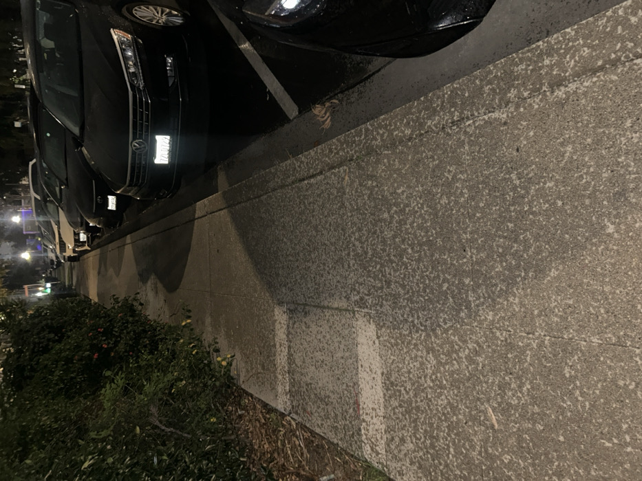 A row of dark-colored vehicles lines a paved street, parked along the curb. The vehicles appear to be cars, with visible headlights and grills. The street is bordered by a concrete sidewalk, showing some weathering or staining. Adjacent to the sidewalk is a dense collection of foliage, including bushes and ground cover, adding a natural element to the urban scene. The lighting suggests it's either late evening or night.