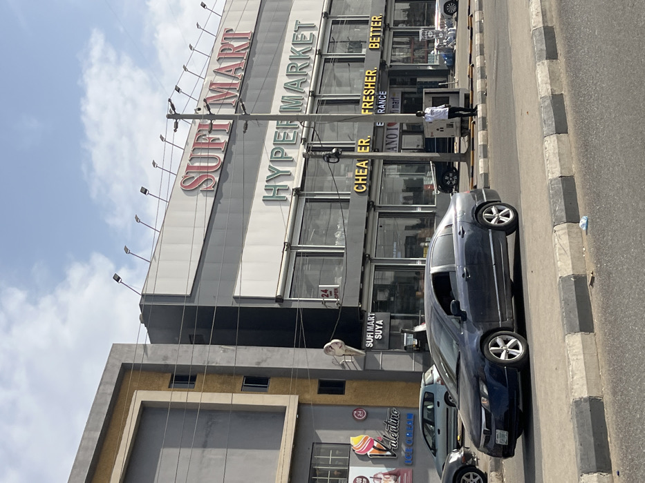 A multi-story commercial building displays the signs "SUFI MART HYPERMARKET" in large letters