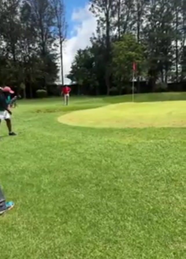golf course on a sunny day with a blue sky and scattered clouds. Lush green grass covers the course, surrounded by tall trees. A person in a red shirt stands near the green with a red flag marking the hole. Another person is visible in the foreground, wearing a white skirt, a dark top with a pink accent, and holding a golf club. The camera pans to the green, where a golf ball rolls slowly towards the hole, stopping just short of it.