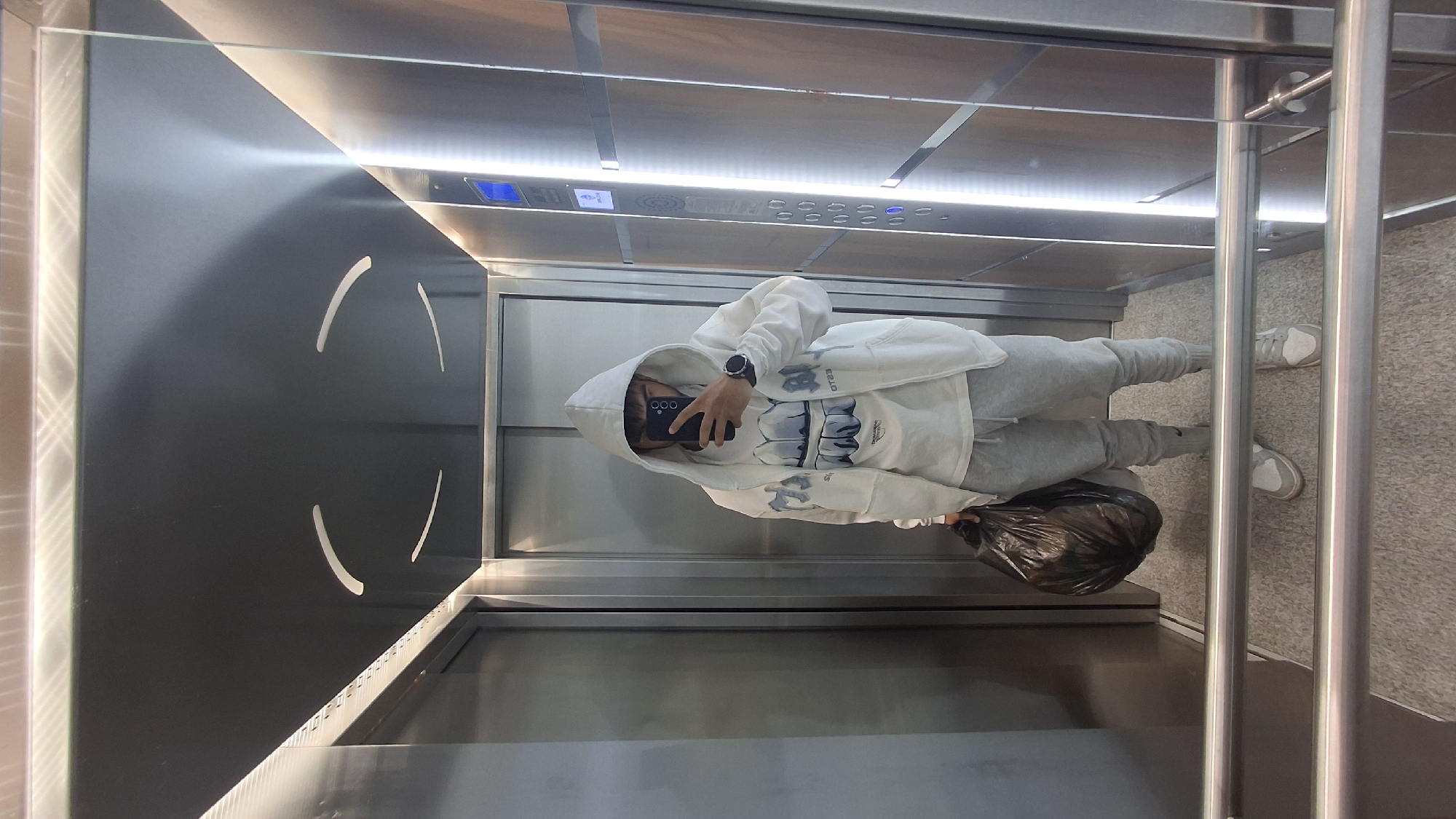 A person wearing a white hoodie and gray sweatpants stands in an elevator, holding a black trash bag