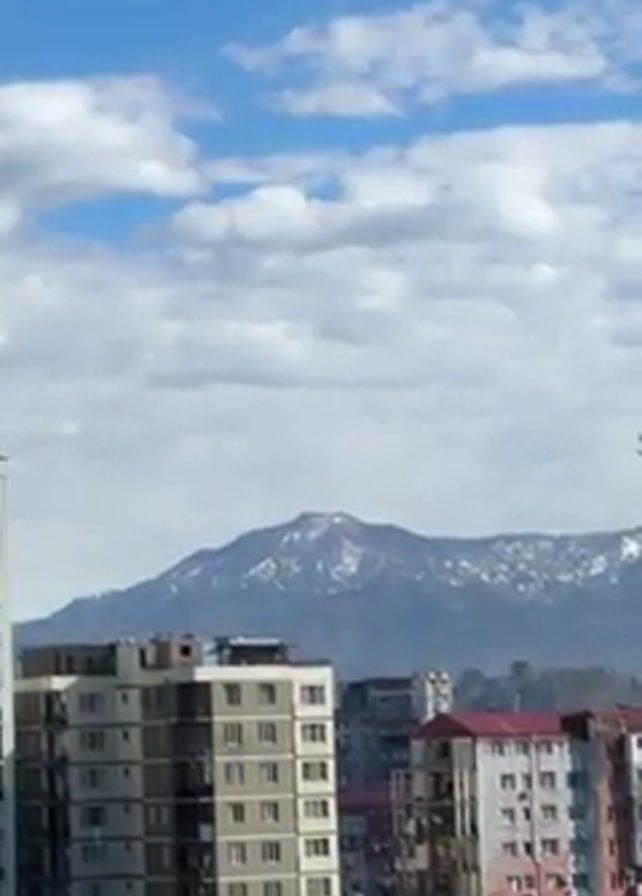 The scene is a static, medium shot of an urban landscape on a partly cloudy day. In the foreground, there are several multi-story residential buildings with a mix of modern and slightly older architectural styles. These buildings are various shades of grey, beige, and pink, and have numerous windows. In the background, a mountain range with snow-capped peaks is visible. The sky is blue with patches of white, fluffy clouds. The overall impression is one of a city nestled near mountains, with an active construction site in the lower-left corner and potential construction-related noise.