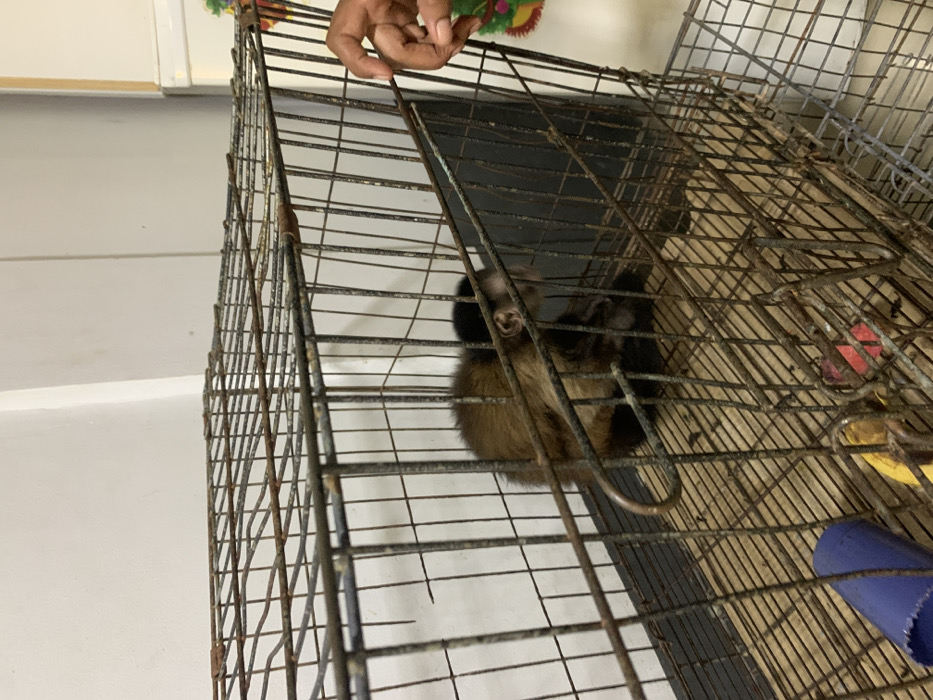 An image taken in Juan Griego, Venezuela, depicts a brown and black capuchin monkey confined within a rusted, wire-mesh cage