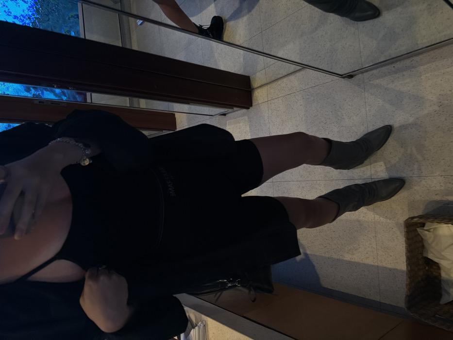 An individual, partially visible and obscured by a smartphone used for capturing a mirror selfie, stands in an interior space within Canggu, Indonesia. The subject, presumed female, wears a black spaghetti strap top, a black blazer or jacket, black cycling shorts, and gray slouchy pointed-toe ankle boots. A silver-colored charm bracelet is visible on her right wrist, and a ring is on her left hand, which is lightly touching her top. A black shoulder bag hangs on her left side. The setting includes a light-colored tiled floor and a long, light-toned countertop to the left with white folded items. A woven basket containing white fabric rests on the floor in the foreground. To the right, a large full-length mirror, possibly framed in dark wood, reflects the subject and parts of the room. In the reflection, a vivid blue element, possibly a water feature or decorative lighting, is visible behind the subject. A smaller mirror adjacent to the main one reflects the lower leg and a black laced combat-style boot belonging to another individual or a distinct reflection.