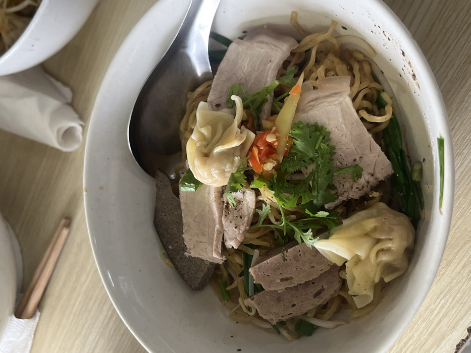 A close-up shows a bowl of noodles, likely Asian cuisine. The noodles are topped with slices of pork, liver, Vietnamese ham, and dumplings. Garnishes include fresh coriander, chilies, and other herbs. A large spoon rests in the bowl. The dish is served in a white bowl and appears to be on a light-colored wooden table, with chopsticks and another bowl partially visible in the background.