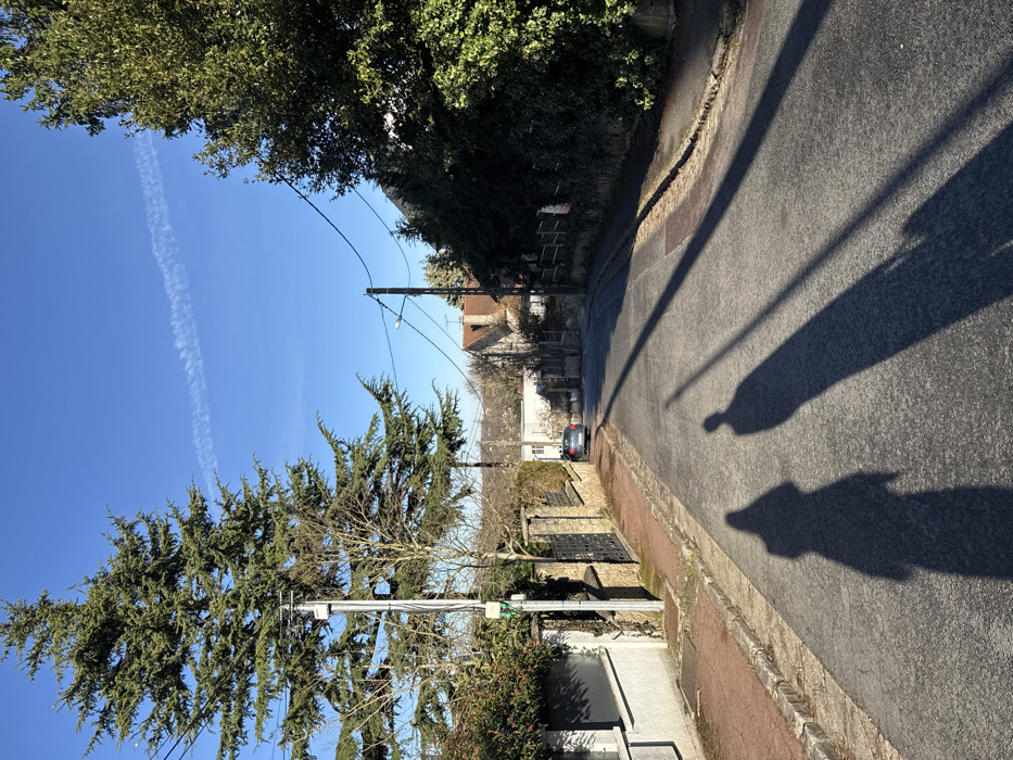 The image displays a residential street in Orsay, France, under a clear blue sky featuring a single linear contrail. The paved asphalt road descends slightly into the distance, framed by sidewalks and walls. In the foreground, two distinct elongated human shadows are cast onto the street, oriented towards the lower right, indicating a low sun angle from behind the camera's perspective. On the left side of the street, a reddish-brown paved sidewalk borders a textured white wall, followed by a stone fence with a dark metal gate. A prominent conifer tree stands in the mid-ground, accompanied by a smaller deciduous tree. A tall silver utility pole, equipped with electrical boxes and conduits, is positioned near the trees. Further down the street on the left, a dark-colored sedan is parked. The right side of the street features a narrow, unpaved shoulder adjacent to a wall densely covered with green vegetation. A dark utility pole with overhead power lines and an attached street light fixture is visible. A building with a reddish-brown tiled roof is partially observable through the foliage on the right. The distant background reveals a landscape with additional structures and vegetation.