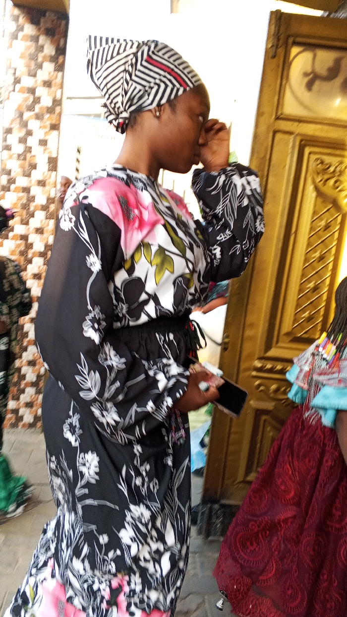 A woman in a black and white floral dress and a patterned headscarf stands near a golden door. She appears to be wiping her eye with her right hand, holding a phone in the other. Another woman, partially visible, wears a red dress and a blue top with beads. The background includes a textured, light-colored wall.