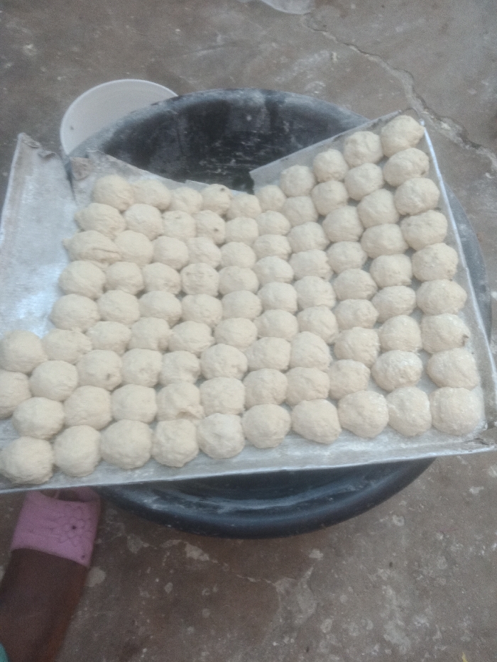 An elevated view depicts a rectangular metal baking tray containing approximately 100-110 uniformly sized, spherical, pale off-white dough balls, arranged in neat rows. The tray rests upon a large, circular black plastic tub, which shows residue of light-colored powder. Behind the black tub, a smaller white plastic bowl is partially visible. The entire assembly is positioned on a grey, dusty concrete or paved ground, exhibiting minor surface imperfections. A human foot, wearing a pink slipper, is partially visible in the lower-left corner of the frame. The scene suggests a stage in food preparation. Location: Unknown, Unknown.
