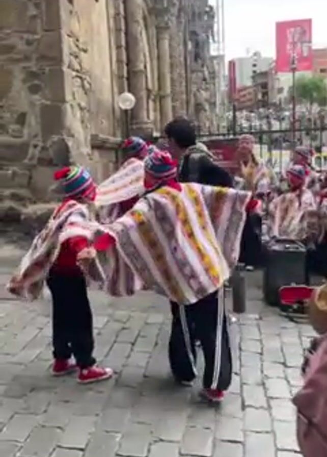 A group of people are dancing on a cobblestone street in what appears to be a public square. They are dressed in traditional clothing, including colorful striped ponchos and hats. Some wear sneakers, while others are in more casual track pants. The dancers are moving in a circle, some holding hands. An additional person in a black and white poncho seems to lead some of the steps. Behind them is a stone building with scaffolding. In the background, there are buildings and other people on the street, with a red sign visible.