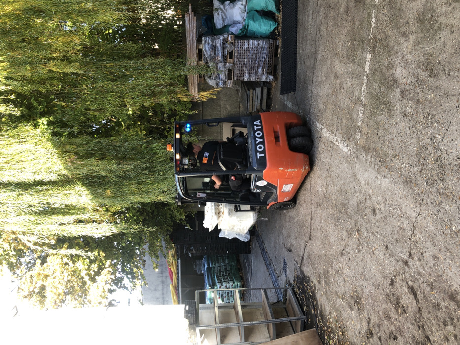 This image depicts an outdoor material storage or industrial yard in Houilles, France. A male individual is operating an orange and black Toyota counterbalanced forklift, positioned roughly in the center-right of the frame, facing slightly left. He is seated in the driver's compartment, wearing a black short-sleeved shirt with an orange logo on the left chest. The forklift has an illuminated amber rotating beacon on its upper left and a blue warning light on its upper right. It is actively carrying a stack of several large, rectangular bundles of white material, possibly wrapped in clear plastic, on its forks. To the left, a metal shelving unit with four empty shelves is visible in the foreground, with a sheet of plywood leaning against it. Further back on the left, stacks of dark-colored bags, possibly on pallets, are arranged, along with stacked black plastic crates and some yellow and red pipes under a partial shelter. The right side of the image features a large tree with dense, weeping green foliage, casting shadows across the scene. In the midground on the right, stacks of wooden pallets are visible, alongside green bags and other bundled items. A black, grid-like mat or panel lies on the ground in the lower right corner. The ground is an uneven, light-colored concrete or asphalt surface with cracks and scattered debris, including leaves. A faded white line is present on the ground in the lower right. Strong sunlight illuminates the scene, creating distinct shadows. A light-colored building wall is partially visible on the far left.