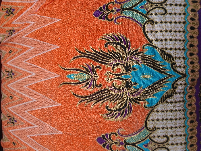 This image presents a detailed, vertical close-up of a textile, showcasing intricate patterns and vibrant colors. The dominant background is an orange fabric with a visible texture. At the top, a series of white zigzag lines forms a border, beneath which are small, stylized floral elements in gold, purple, and light green. The central design features a prominent, symmetrical motif of two stylized birds, possibly peacocks or mythical creatures, facing each other. These birds are rendered primarily in black with extensive gold outlining and feather details, incorporating bright turquoise and purple accents. This central avian motif is flanked by smaller, ornate scrollwork or floral designs in black, gold, purple, and turquoise. Below this, a white horizontal band is patterned with vertical lines of small gold dots. The lowest visible border consists of a repeating scalloped or teardrop pattern in gold, brown, and purple hues, outlined with turquoise. The image is a macro view of fabric and contains no visual information regarding its physical location within the city of Pokhara, Nepal, nor does it depict any people, environmental context, or specific actions or interactions.