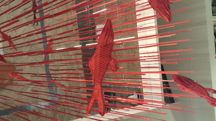 A striking display features a cluster of stylized, crimson-colored fish suspended amidst a dense network of thin, horizontal red strips