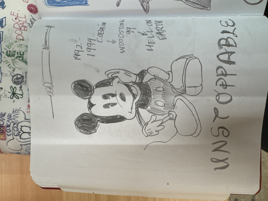 An open notebook or sketchbook, featuring a red spine or cover edge on its left, is positioned on a light-colored surface, possibly wood. The visible page contains multiple pencil drawings and handwritten text. Centrally located is a sketch of Mickey Mouse, depicted in black and white, wearing his characteristic shorts with two buttons and white gloves. His left hand is raised towards his ear, while his right hand points downwards. Above the Mickey Mouse drawing, a simple line drawing of a hypodermic syringe with a needle is present. To the right of Mickey Mouse, handwritten text is arranged vertically, reading "1992 - 1994 -", followed by "COBAIN" with a downward arrow, then "WOODSTOCK '99" with another downward arrow, and finally "HELL ON EARTH". Below the Mickey Mouse illustration, the word "UNSTOPPABLE" is written in thick, stylized capital letters. The area immediately above the notebook displays a fabric or paper background with repeated patterns including "COXCANECOXCANECOXCANE" and various smaller doodles such as a stylized head, a football player, a flower-like symbol, and text including "HARD TO GIT" and "DODGE BALL." The image provides no visual information or landmarks to indicate a location in the city of Paris, France, or any specific geographical setting.