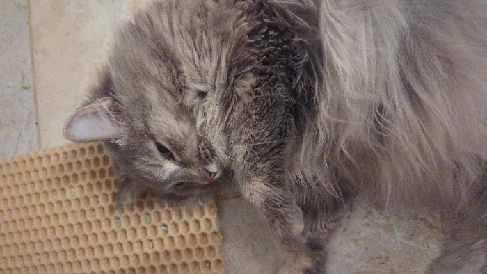 The scene depicts an interior setting in Krasnoyarsk, Russia. A single domestic cat, with long, dense, grey-silver fur, lies on a light-colored tiled or laminate floor. The cat is positioned on its left side, its head slightly turned, with its eyes partially closed and looking downwards. Its pink nose and prominent white whiskers are visible. A white patch of fur is present above its left eye. Its front paws are tucked close to its chest. Adjacent to the cat's head, on the floor, is a beige-colored mat featuring a repeating hexagonal or honeycomb pattern. Small green particles, possibly plant material, are visible on the surface of the mat. No other subjects or active interactions are present in the frame.
