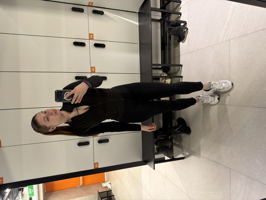 A female subject stands in a changing room in Surgut, Russia, capturing a mirror selfie with a dark-colored smartphone held in her left hand. She is attired in a black long-sleeved athletic top, black leggings, and white and grey athletic shoes. Her hair is pulled back into a ponytail, and a tattoo is visible on her upper chest. The background consists of a wall of white lockers with black digital locks and orange numerical labels such as "P8" and "A-8." A black bench is positioned along the base of these lockers. Various footwear items are present on and beneath the bench, including black boots, a pair of white high-heeled boots, and a pair of black high-heeled ankle boots. The floor is covered with light-toned, large-format tiles. A reflection in the mirror on the left reveals a section of an orange wall and a green sign with Cyrillic text, likely indicating an exit.