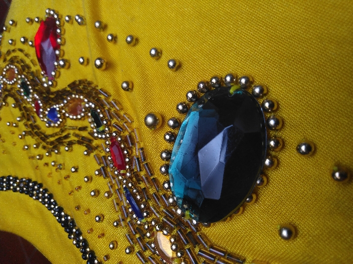 The image displays an extreme close-up of a yellow textile, intricately adorned with beads and faceted gemstones