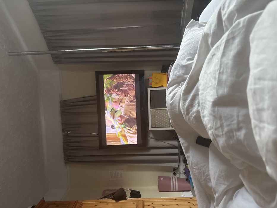 The image displays an interior domestic room, observed from a low perspective, consistent with being situated within a bed. The specific location within London, United Kingdom, cannot be determined from the visual information provided. The immediate foreground consists of rumpled white bedding, within which a dark, cylindrical object is partially visible. The room's walls are painted a light cream color, topped with white coving. The ceiling is white and textured. Centrally located against the wall, a flat-screen television is mounted, displaying a scene featuring a person in a light-colored coat and hat, partially obscured by green foliage, alongside a creature-like figure. Below the television, a white modular storage unit with two cube compartments is present; one compartment contains a white-and-grey polka-dotted fabric drawer. To the right of this unit, a bright yellow bag rests on the floor. On the right side of the frame, a polished silver pole extends vertically from the floor to the ceiling, positioned in front of a drawn grey fabric curtain. A second, matching grey curtain covers an adjacent window behind the television. On the far left, a tall, light-toned wooden wardrobe or cabinet is visible. Two handbags, one dark brown and one black, hang from a fixture on its side. Leaning against the wall near the base of the wardrobe is a rolled-up pink yoga mat with white stripes and an Adidas logo. A white sheet of paper with printed text is affixed to the wall between the wardrobe and the left curtain. No individuals are physically present within the room, though figures are depicted on the television screen.