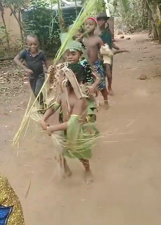 A group of children in what appears to be a village or rural setting are walking in a line on a dirt path. Several of the children are adorned in costumes made of green leaves. The costumes are wrapped around their bodies, with some children wearing leaf hats as well. They are carrying various items like palm fronds and bunches of straw. One child in the front holds a bundle of dried plant fibers. The background shows lush green vegetation including palm trees, and a water tank is visible behind the children. The children appear to be participating in a local tradition or performance.