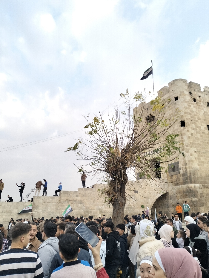 A large crowd gathers before a stone wall and tower topped with a flag. People stand on the wall and wave flags, while many more are in the foreground. A bare tree stands between the crowd and the structure. Many people are wearing hijabs. A person holds up a smartphone in front of the crowd. The sky is overcast.