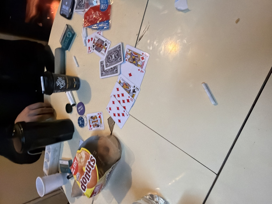 A cluttered table displays playing cards, including the 7, 8, and 9 of diamonds