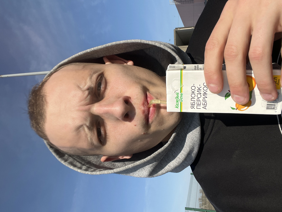 An individual is depicted outdoors under a clear blue sky in Верхнетемерницкий, Russia. The subject, an adult male, is shown from the upper chest upwards, wearing a grey hooded sweatshirt over a black garment. He has short, light brown hair and is looking directly at the camera with slightly furrowed brows. He is actively drinking from a small, white juice carton held to his mouth by his right hand, using a yellow corrugated plastic straw. The carton displays "Каждый День" and "ЯБЛОКО-ПЕРСИК-АБРИКОС" in Cyrillic, with an illustration of peaches and an apricot leaf. In the background, a green mesh fence is visible to the left. A tall, slender utility pole extends vertically on the upper right, and a light-colored building with a dark opening is partially visible further in the background to the right. The scene is brightly illuminated by sunlight.
