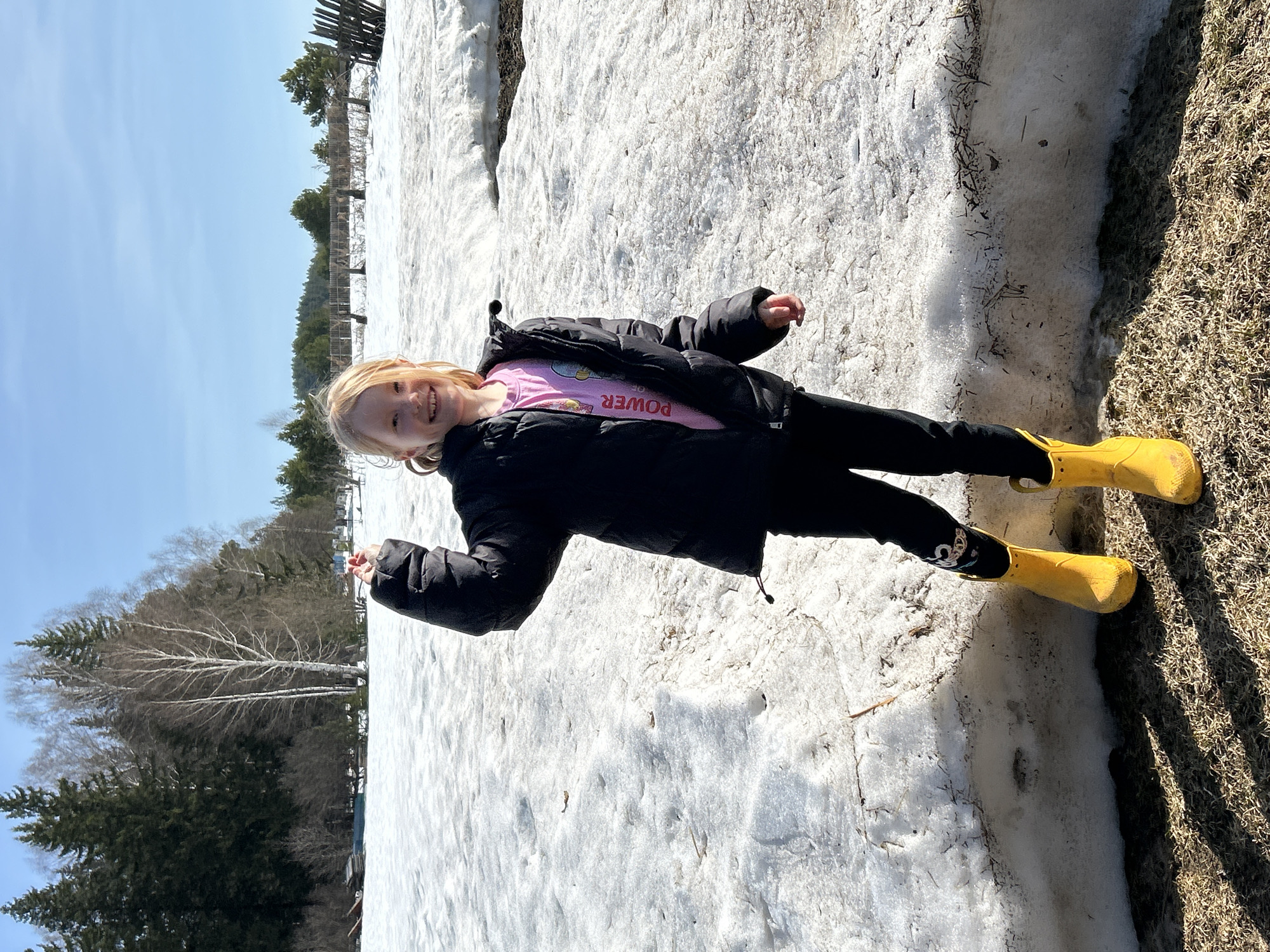 A young girl stands on a patch of melting snow in Уральское, Russia. She is wearing a black jacket, pink t-shirt, black leggings, and yellow boots. She is smiling and holding up a small piece of snow. The snow patch is bordered by grass, and there are trees and a fence in the background. The sky is blue.