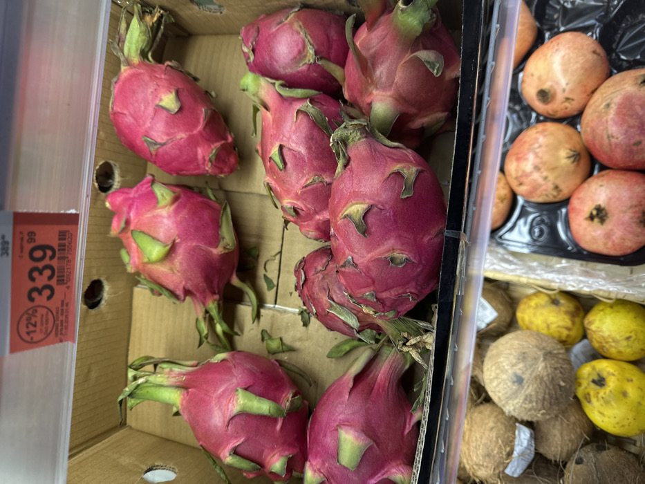 Dragon fruits are displayed in a cardboard box, next to a selection of fruits including pomegranates, coconuts, and lemons. The dragon fruits have pink skin and green scales. The price tag on the box indicates a reduced price, originally 389 to 339. The fruits are arranged in a store display.