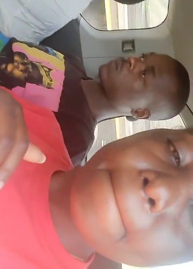 The video appears to be taken from inside a moving vehicle. Three people are visible. One in a red shirt is in the foreground, filming. Another person, wearing a black t-shirt with colorful graphics, is in the middle seat. A third person in a white shirt is visible towards the back of the vehicle. Outside the window, there's a view of a roadside, a steep, vegetated hill, and a body of water in the distance under a partly cloudy sky. There's a guardrail visible along the road.
