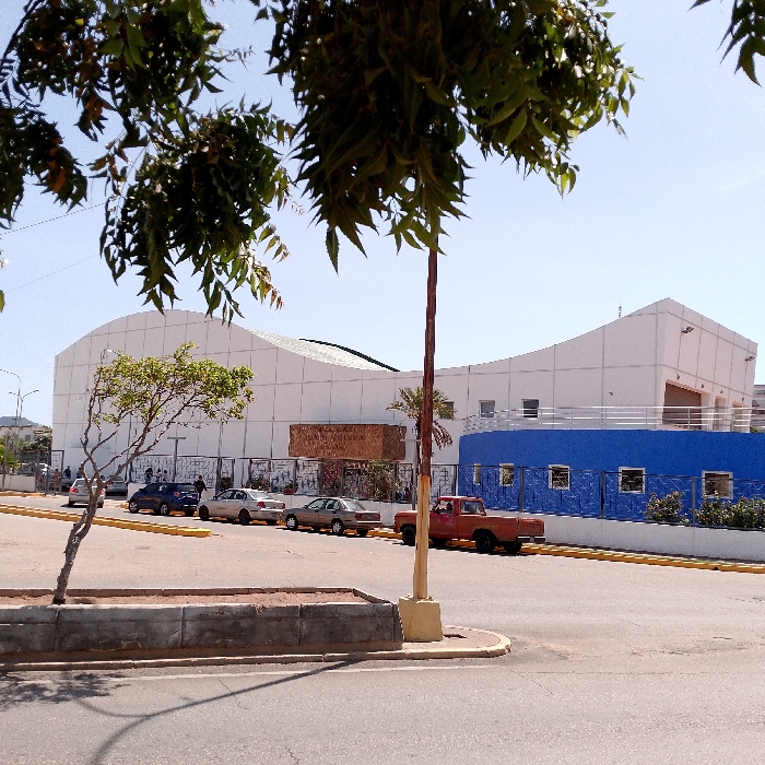 A white building with a curved roof is partially obscured by trees. A brick section and a blue wall with white square accents adorn the lower right side of the building. Several parked cars line the street in front, including an orange pickup truck. The foreground features a concrete planter and the shadow of a tree branch on the road. The sky is clear and blue.