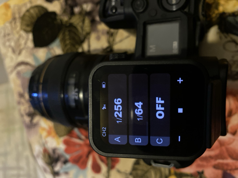 The image displays a close-up, high-angle view of a black digital camera flash trigger or controller, resting on a floral patterned fabric surface. The device's illuminated screen is prominent, showcasing white text against a dark background. The top status bar indicates "CH2", a flash symbol with "H" (likely for High-Speed Sync), and a near-full battery icon. Below this, three flash power settings are displayed: "A 1/256", "B 1/64", and "C OFF". The bottom of the screen features a row of control icons: a minus sign, a square, and a plus sign. A knurled control dial is visible on the right side of the device. Behind the flash controller, a black camera body with an attached lens is partially visible and out of focus. The lens has faint numerical markings such as "2.75". To the right of the controller, a portion of the camera's top plate is discernible, including a small, blurred screen displaying a gray 'M' within a square, indicating Manual mode, along with other indistinct control elements. The entire setup is situated on a soft, out-of-focus fabric surface adorned with a pattern of red, green, yellow, and brown flowers and leaves. The scene is illuminated by an internal light source. This equipment is located in Jos, Nigeria.