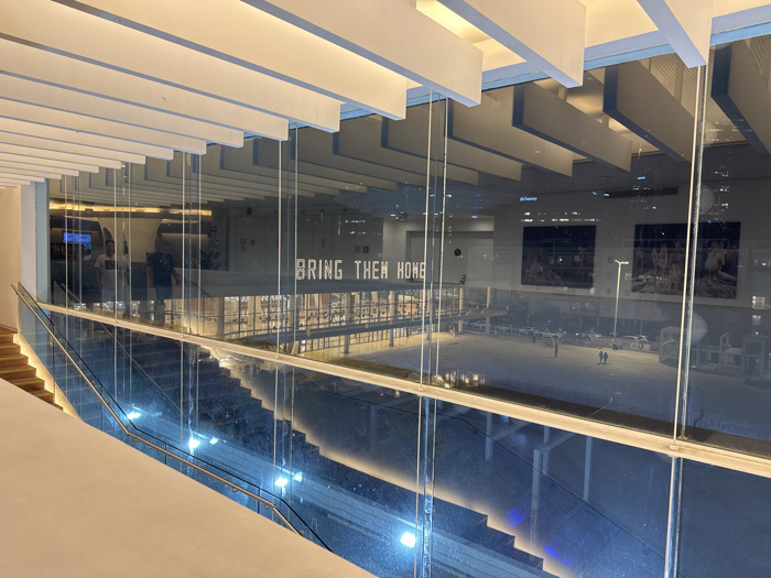 The image depicts an elevated view from a modern interior overlooking Hostages Square (Kikar HaHatufim) in Tel Aviv, Israel, at night. The foreground features a white slatted ceiling with integrated lighting and a descending wooden staircase with a glass and metal railing, also illuminated. Through a floor-to-ceiling glass facade, the outdoor urban plaza is visible. In the mid-ground, a large, illuminated outdoor square is present. On a distant building, the phrase "BRING THEM HOME" is prominently displayed in large white capital letters. Below this sign, approximately two individuals are observed walking across the expansive paved area. Several light-colored vehicles are either parked or in motion further in the background. Large, indistinct images are displayed on prominent screens on the distant building facades. An elevated pedestrian walkway or structure spans part of the plaza. Two male figures are reflected in the glass facade in the mid-left, one in a light shirt and the other in a dark shirt, appearing to move parallel to the glass. The indoor environment is brightly lit with warm white artificial light, while the outdoor plaza is illuminated by cooler white/blue artificial streetlights.