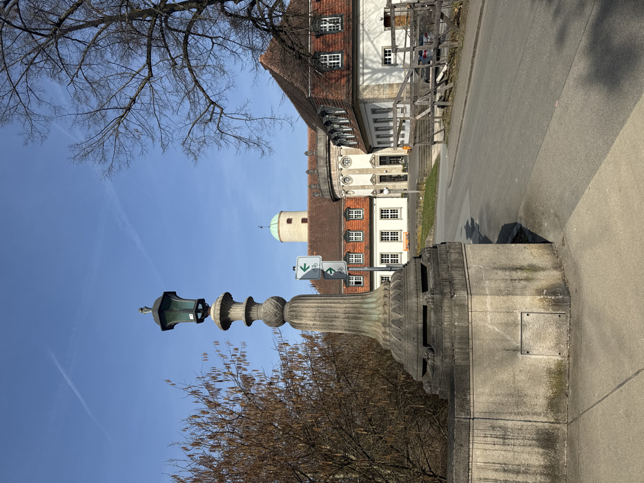 The image displays an exterior scene of the Sprudelhof complex in Bad Nauheim, Germany, captured on a sunny day under a clear blue sky with two faint contrails. In the immediate foreground, to the left, a tall, ornate stone lamp post with a dark, possibly bronze-green, lantern housing stands atop a substantial, light-grey stone structure, likely a bridge railing. The lamp post base features carved details, and the supporting wall below contains a rectangular access panel. Adjacent to the left, a leafless deciduous tree with visible catkins is present. An asphalt road occupies the center-right foreground, curving towards the background. To the right of the road, a wooden fence structure runs parallel to the asphalt. Behind this fence, a silver sedan is partially parked. A bare deciduous tree frames the upper right portion of the image. In the midground, two vertically stacked white square signs, each with a green border and a black bicycle pictogram, are visible. The upper sign displays a left-pointing arrow, and the lower sign indicates a straight direction. The background is dominated by the historic Sprudelhof complex. This multi-building structure features red-tiled roofs, numerous white-framed dormer windows, and light-colored facades. A prominent, cylindrical, light-colored tower with a conical turquoise-green roof is positioned on the left side of the complex. The central section exhibits a circular, neoclassical architectural element with large windows. The ground in front of the buildings is a combination of paved surfaces and green grass patches. No human figures or animals are visible.