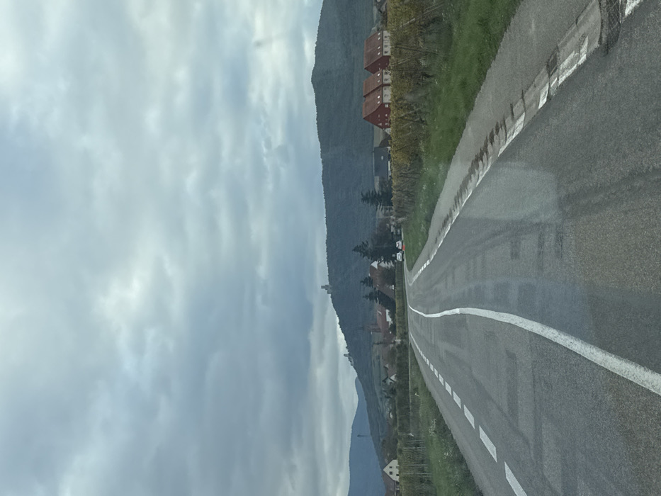 This photograph captures a rural landscape near Sélestat, France, on an overcast day. The scene is dominated by a two-lane asphalt road in the foreground, appearing wet and reflective, with a solid white center line transitioning to a dashed line, flanked by dashed white shoulder markings. The road curves slightly to the left as it recedes into the midground. To the left of the road, a green grassy verge gives way to rows of grapevines, their leaves exhibiting yellowish-green autumn coloration. Beyond the vineyards, a small village cluster is visible, featuring houses with light-colored facades and dark roofs, along with what appears to be a dark steeple of a church. Two light-colored vehicles are parked or slowly moving on the road as it enters the village. To the right of the road, another green verge parallels the road, followed by extensive rows of similarly colored grapevines. Behind these vineyards, two distinct, nearly identical residential buildings with prominent red tile roofs and light-colored walls are situated. In the background, a large, forested hill, part of the Vosges foothills, dominates the horizon. Perched prominently atop this hill is the Château du Haut-Koenigsbourg, identifiable by its multiple stone towers and battlements. Further to the left, additional, more distant hills are visible. The sky is entirely overcast with a uniform layer of grey clouds, indicating diffused, low-contrast lighting conditions. No individuals or overt actions are discernible within the frame. The overall impression is one of a tranquil, unpopulated rural environment.