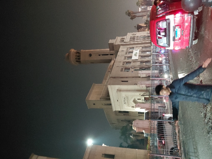 An individual stands on a street, arms outstretched, near a barrier and a red vehicle. A multistory building with a tower dominates the background. The architecture includes arched entrances, multiple windows, and Islamic architectural elements. Streetlights illuminate the scene, which appears to be at night. The sky is dark.