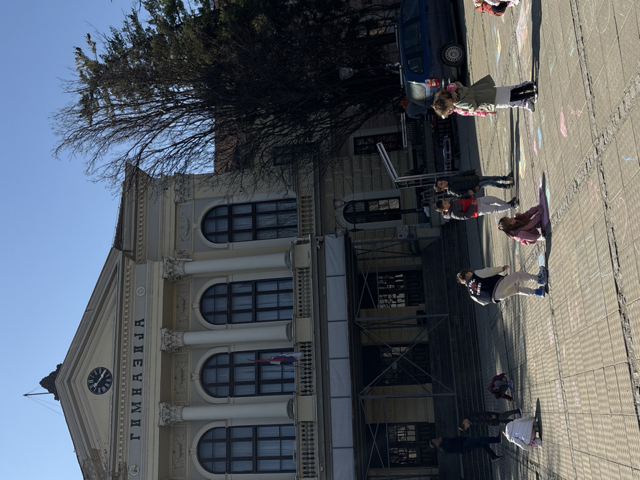 The image displays the First Kragujevac Grammar School (Прва крагујевачка гимназија) at Svetozara Markovića 1, Kragujevac, Serbia. The historical building features a neoclassical facade in cream and white, with a central pediment containing a clock indicating approximately 10:45. The word "ГИМНАЗИЈА" is inscribed below the clock. Four arched windows with dark frames and visible curtains line the upper floor, above a balcony railing from which a Serbian flag hangs. The main entrance, accessed via a wide staircase, is partially obscured by scaffolding or temporary support structures. A large, leafless deciduous tree stands to the right of the building, with a coniferous tree visible behind it. In the foreground, a light-colored paved plaza contains numerous multi-colored chalk drawings. Eight children are visible on the plaza. Three children are kneeling or bending forward, actively drawing with chalk. Two boys stand conversing in the left-center. Two girls stand embracing on the right. A dark blue minivan is parked on the right side of the plaza, partially visible. One adult male in dark attire walks up the steps towards the school entrance on the far left. The scene is illuminated by sunlight under a clear blue sky.