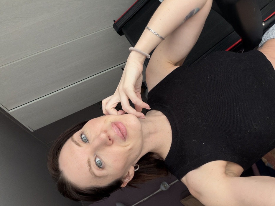 A female individual is depicted in a close-up indoor selfie, located within a residential space in Perm, Russia. The subject, appearing to be in her late 20s to early 30s, possesses light skin, light blue eyes, and dark brown hair. She is wearing a black, ribbed, sleeveless crop top. On her left wrist, she wears a light-colored beaded bracelet and a silver-toned braided bracelet. Small silver hoop earrings are visible in both ears. Her left hand is positioned near her chin, with fingers lightly curled and resting against her jawline. Her expression is a subtle smile, and she is looking directly at the camera. The background indicates an interior setting, featuring a light-colored two-door wardrobe or cabinet to her right, and a dark-colored piece of exercise equipment with red accents partially visible behind her right arm. A purple-toned wall or fabric and a wall-mounted light fixture are partially visible on the left side of the frame. The overall lighting is bright and even, consistent with an indoor environment.