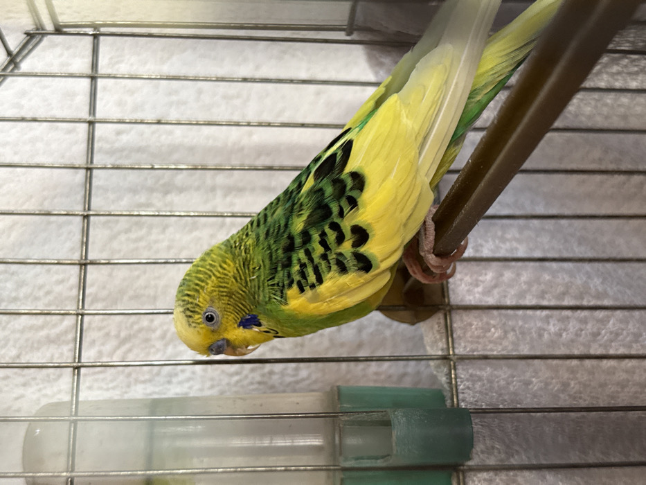 - "A yellow and green budgerigar (Melopsittacus undulatus) is observed perched on a dark brown, cylindrical bar within a metal cage" by FM-CCOQt1, licensed under CC BY 4.0